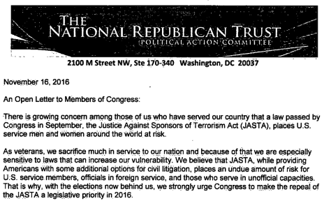 28Pages.org reached one of the individuals listed on the letter: Daniel Bazikian, who served in the Army from 1968 to 1971. He says he has donated to National Republican Trust PAC on several occasions and, while he has no recollection of supporting the anti-JASTA effort several months ago, he notes that he receives many emails inviting him to sign petitions.