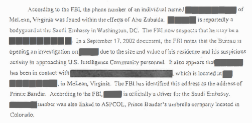 When 28 pages on Saudi links to the 9/11 attacks were declassified in 2016, they revealed that coalition forces also retrieved Zubaydah’s telephone book, and that it held U.S. phone numbers—one of which was linked to an unlisted number associated with the Colorado mansion of the Saudi ambassador, Prince Bandar bin Sultan.